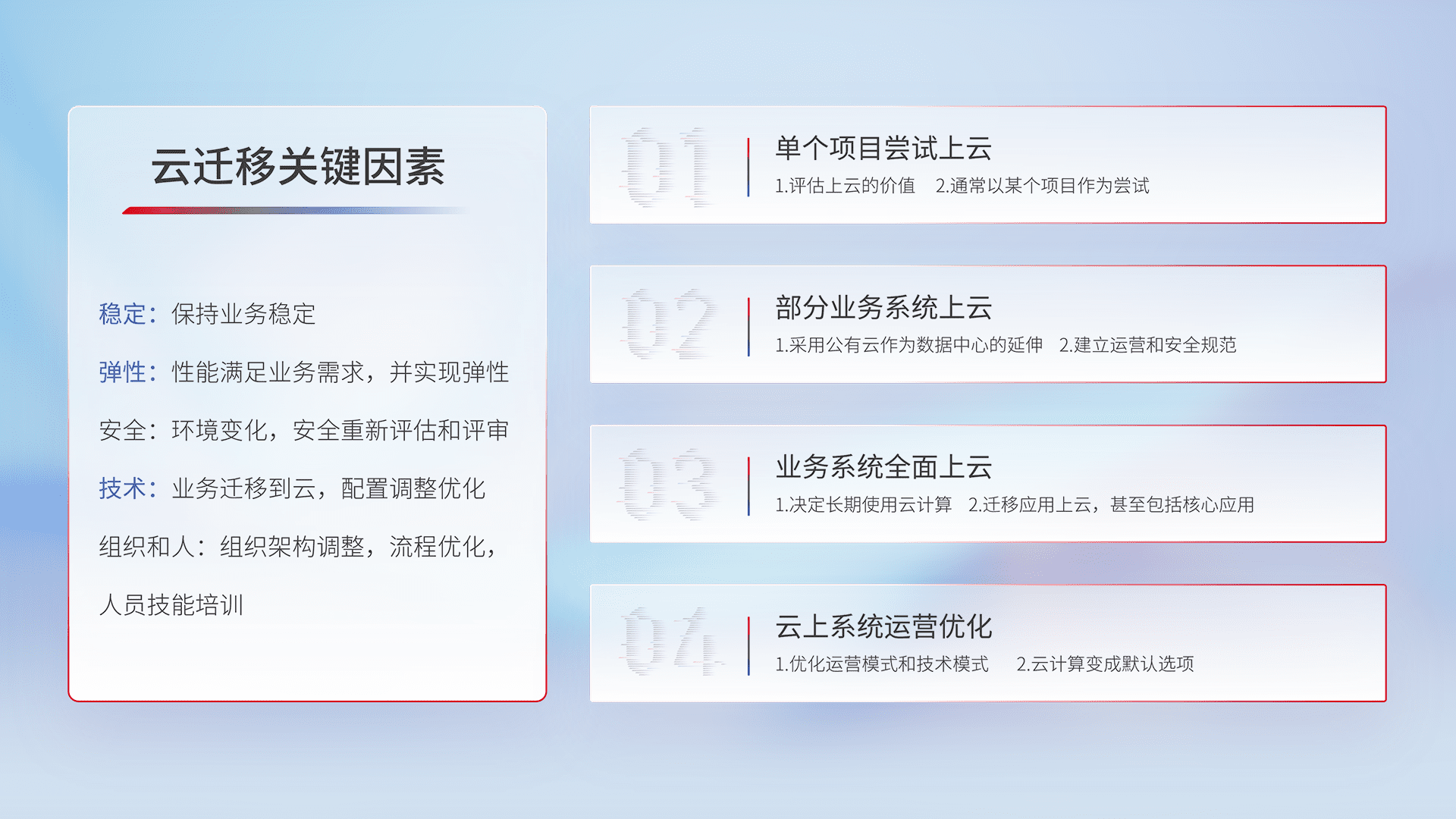 结合实际业务,,从规划设计、、、、云平台选型、、、、云原生改造、、、数据迁移、、、、集成交付,,迁移全过程为客户识别最佳上云路径,,,做好风险识别管理,,设计网络架构、、身份权限、、、安全审计合规、、、、操作审计、、、日志审计、、、监控告警策略、、、、多站点容灾设计等,,对云上基础设施进行整体规划,,提升IT治理水平,,,,以满足弹性、、、、高可用、、高性能的需求。。。。