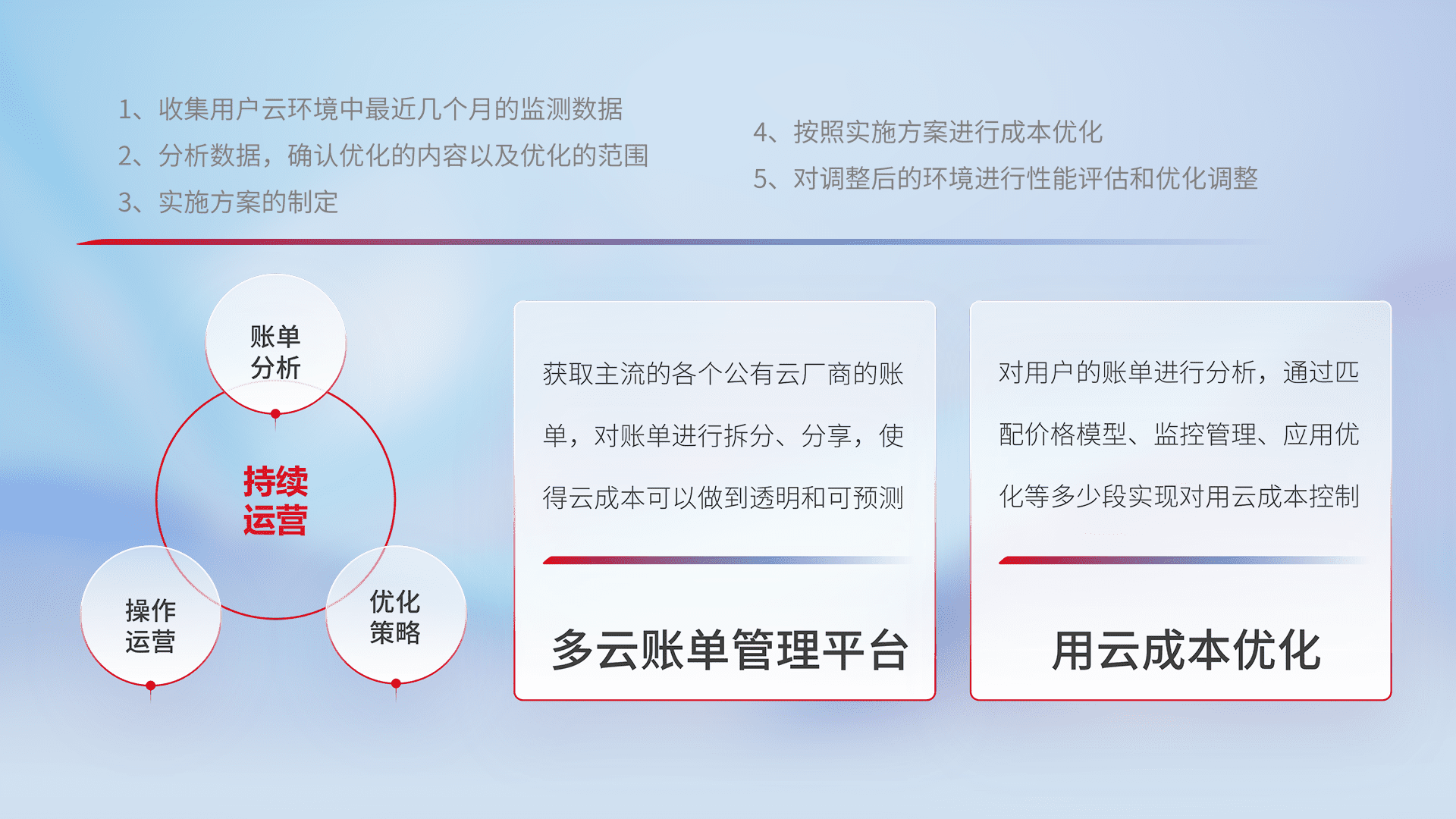 通过多云纳管,,,以统一的资源数据模型把客户的云资源进行抽象和封装,,进而实现对多云资源的统一操作,,,,保障云资源管理的可靠性、、、、稳定性与可用性。。量身定制化运维内容,,配置、、、、开发运维、、补丁管理、、、、备份、、监控、、、认证和访问管理、、、、审计和日常巡检等,,保障在用云过程中的可靠度,,稳定度以及高可用率。。。。